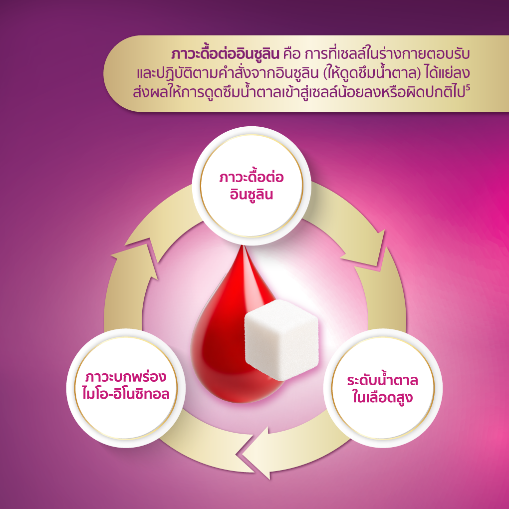‘ภาวะดื้ออินซูลิน’ จุดเริ่มต้นของปัญหา หนึ่งในสาเหตุสำคัญของโรคเบาหวานส่วนใหญ่คือ ‘ภาวะดื้ออินซูลิน’ (Insulin Resistance) ซึ่งจะเกิดขึ้นเมื่อเซลล์ร่างกายตอบสนองต่ออินซูลินได้ลดลง ทำให้ร่างกายต้องผลิตอินซูลินมากขึ้นเพื่อควบคุมระดับน้ำตาลในเลือด เมื่อภาวะดื้ออินซูลินเกิดขึ้นต่อเนื่อง จะทำให้ระดับน้ำตาลในเลือดค่อยๆ สูงขึ้น ตับอ่อนทำงานหนักขึ้น และในระยะยาวอาจนำไปสู่โรคเบาหวานได้ ดังนั้นถ้าต้องการลดระดับน้ำตาลสะสมอย่างยั่งยืน ต้องแก้ที่ต้นเหตุของปัญหา นั่นคือ การช่วยให้ร่างกายลดภาวะดื้ออินซูลิน เพื่อให้อินซูลินตามธรรมชาติกลับมาทำงานได้อย่างมีประสิทธิภาพมากขึ้น
